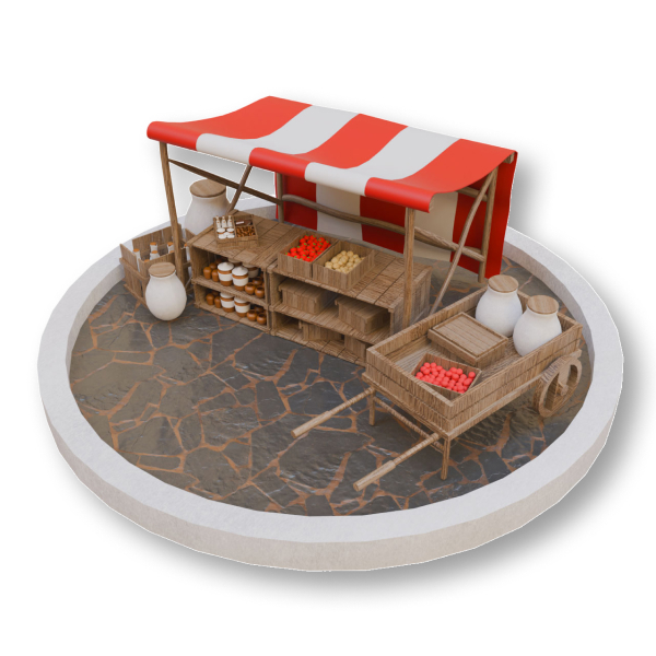 A modular, ready-to-use 3D medieval market stall. It has been completely designed in Blender with a neat and efficient structure, making the wooden buildings, crates, jars, barrels, and transport carts suitable for various types of games.