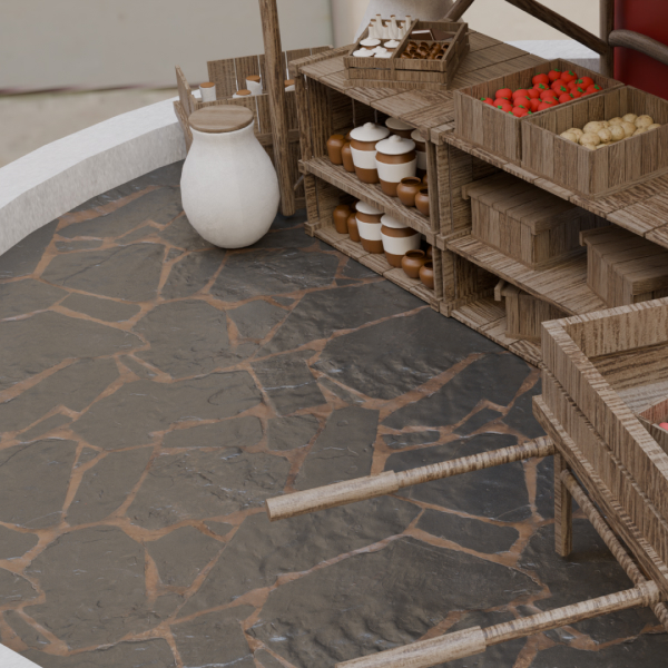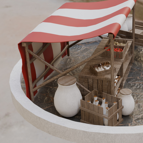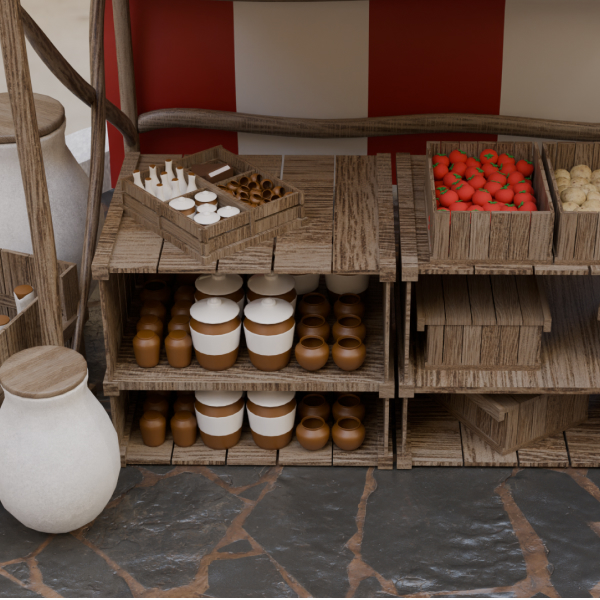 - Create the stall and prop models (such as crates/jars/barrels and transports) in Blender using a high-definition, clean topology setup and optimized polygon flow.